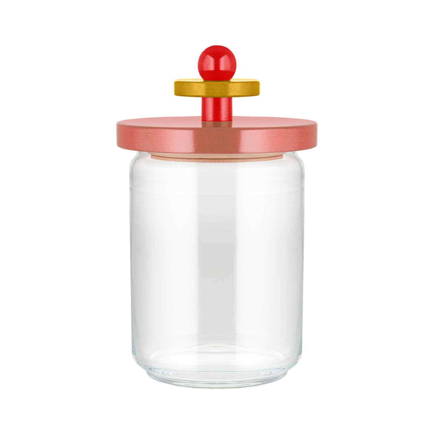 Barattolo ermetico in vetro con coperchio in legno di faggio, rosa, rosso e giallo. Alessi 100 Values Collection. Designer Ettore Sottsass.