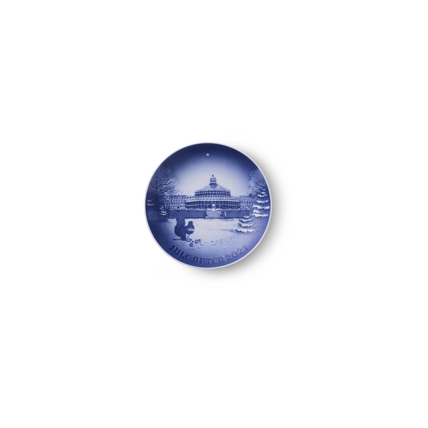 Una spessa coltre di neve ricopre il Giardino Botanico di Copenaghen. Un simpatico scoiattolo ha trovato la strada per il prato davanti alla vecchia Palm House del 1874, dove si gode il paesaggio e il suo spuntino preferito. Quest'anno, il motivo della serie di piatti annuali Bing & Grøndahl, creata da Dag Samsund, raffigura lo storico giardino botanico nel centro di Copenaghen, dove si trova dal 1870. Le targhe annuali sono state emesse ogni anno dal 1895.