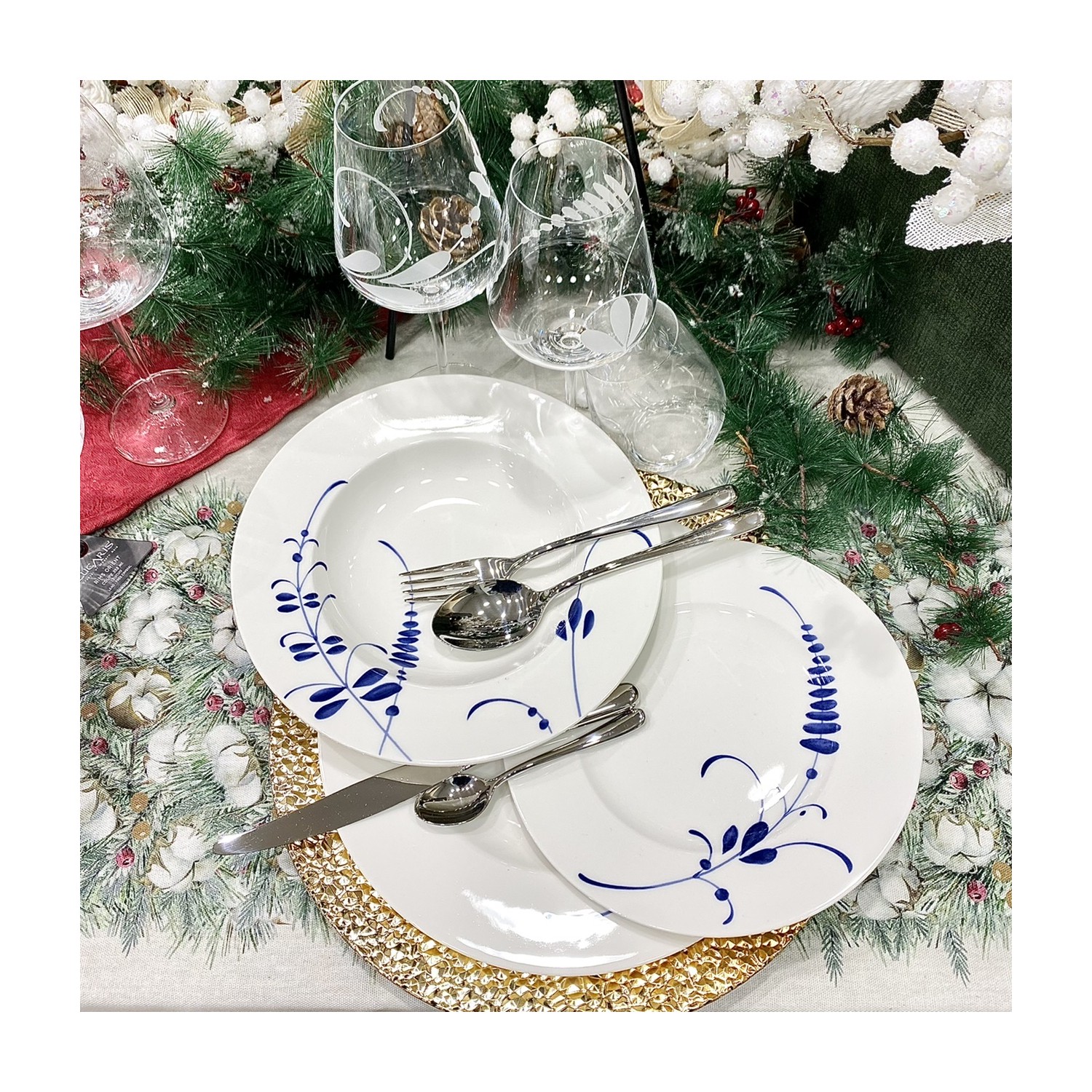 6 piatti piani, 6 fondi, 6 dessert, base bianca.
