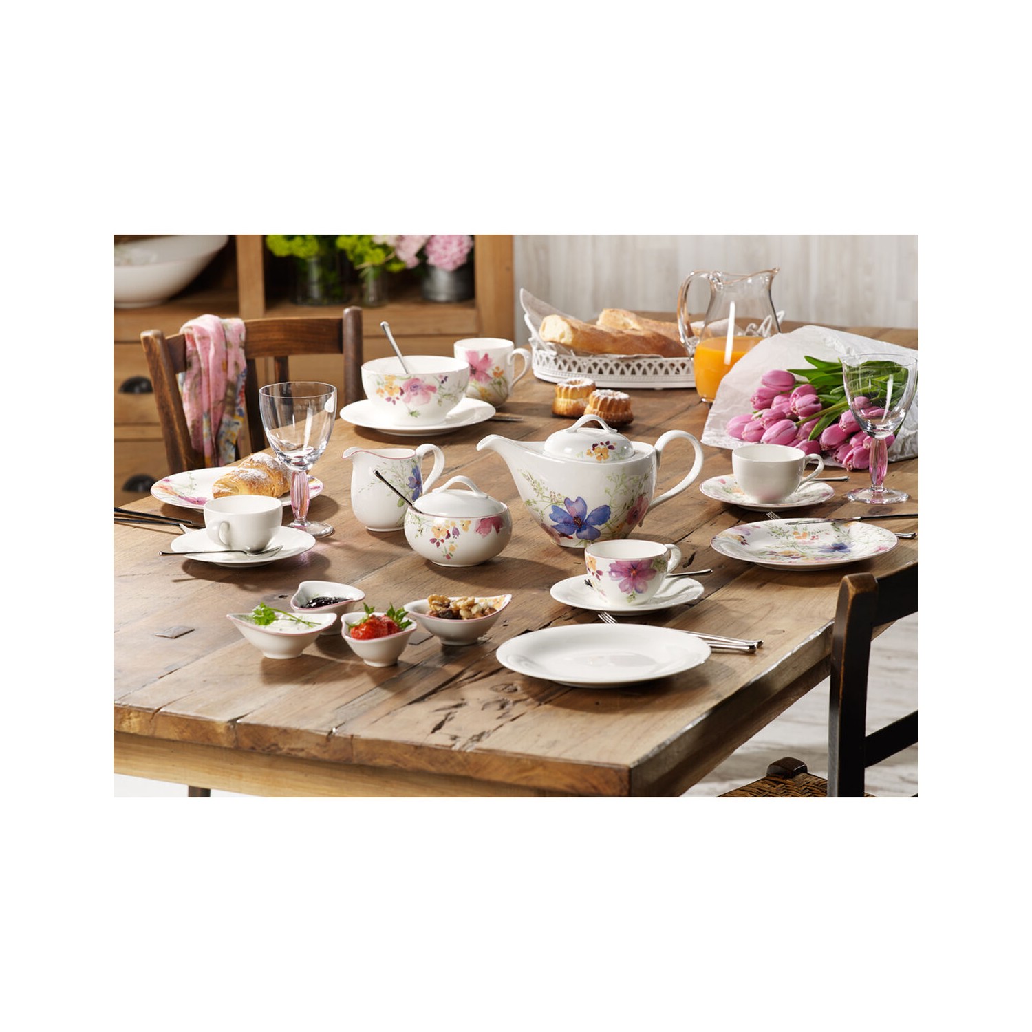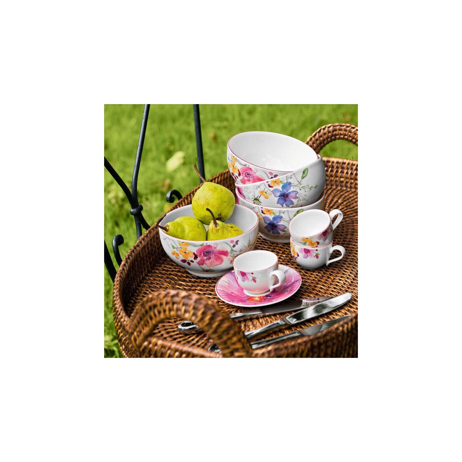 I delicati colori di Mariefleur Gris faranno nascere sulla vostra tavola un mare di fiori in blu e grigio. Le forme eleganti e sinuose della porcellana permettono di preparare e servire i vostri piatti con una grazia tuttora ineguagliata.
