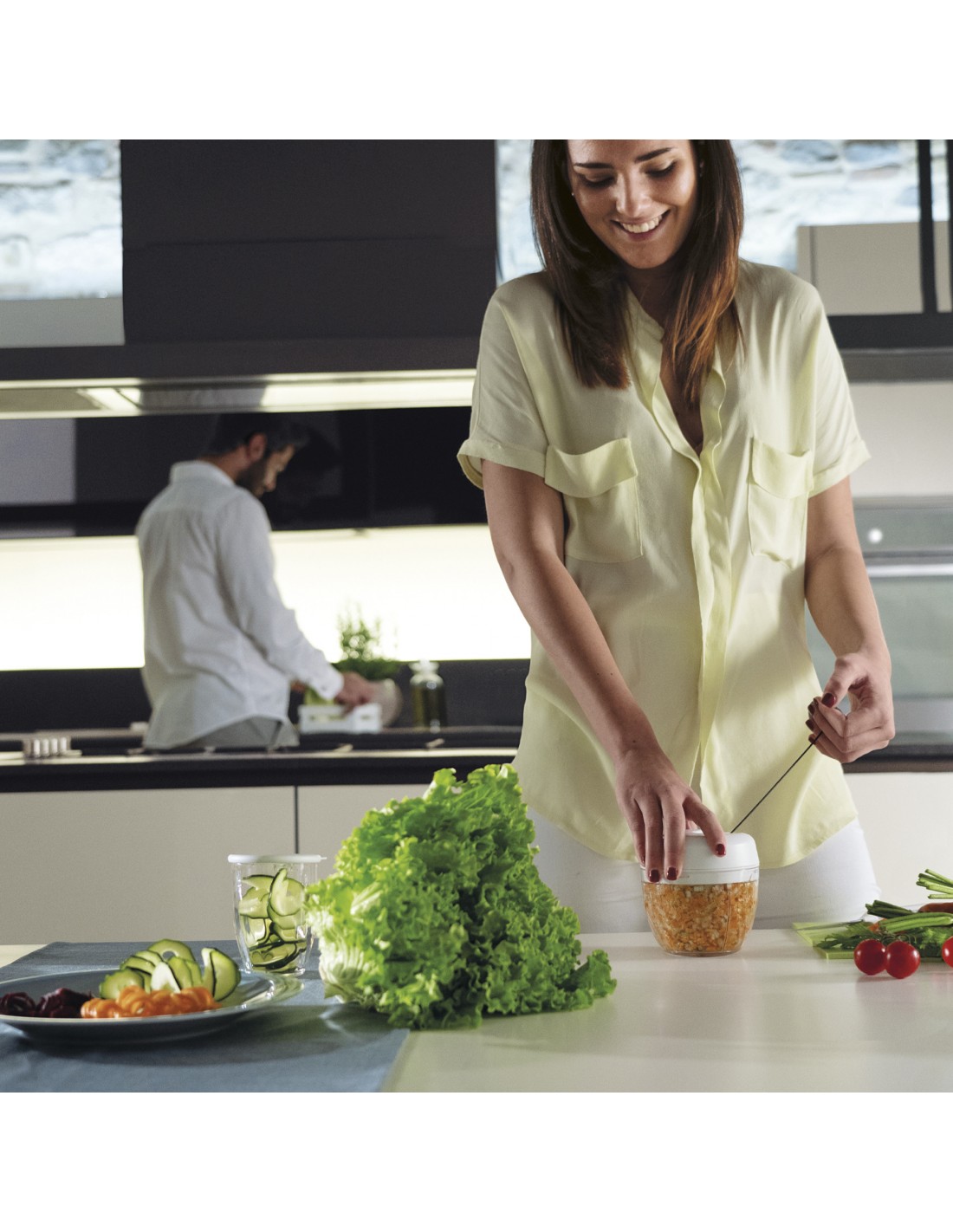 Il tritaverdure manuale Chop&Store è ergonomico grazie al pomello con ampia superficie di presa, sicuro e stabile grazie alla guarnizione antiscivolo posta sul fondo e al coperchio con aggancio e, una volta estratto il meccanismo, lavabile in lavastoviglie. E' dotato di un secondo coperchio ermetico che permette di chiudere il contenitore e conservare così, al suo interno, i cibi in frigorifero.