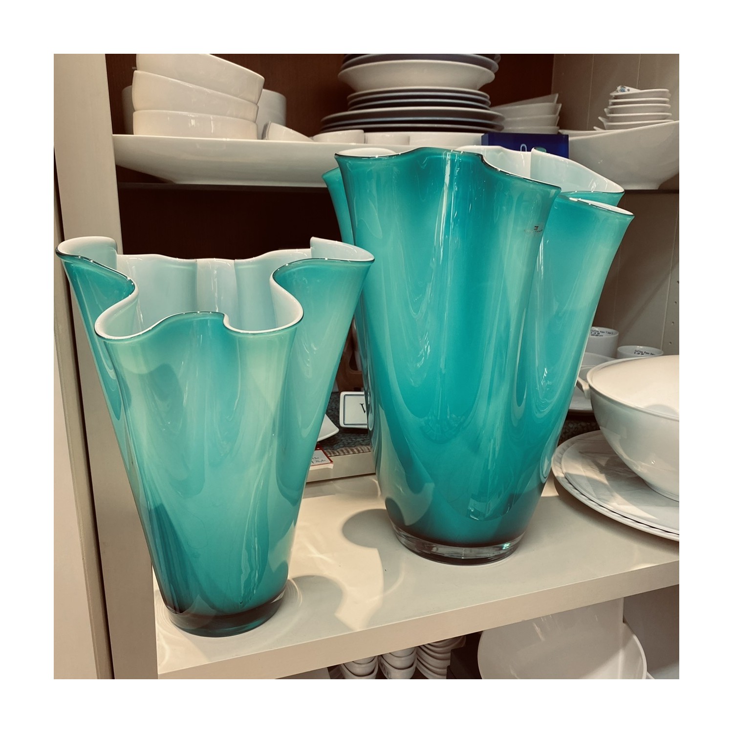 La Bellezza di un vaso dalla linea morbida come una onda, realizzato in vetro soffiato a bocca, incamiciato e lavorato a mano da maestri vetrai.